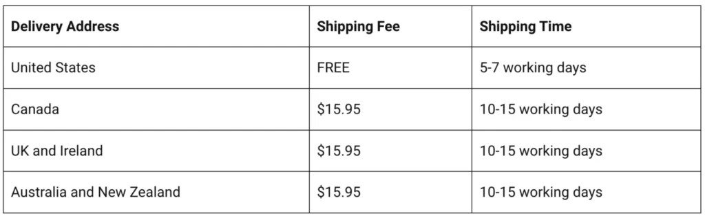 Orders are processed within 2–3 business days. U.S. delivery typically takes 5–7 days, while international orders may take up to 10–15 days. Tracking details are usually sent within 60 hours.